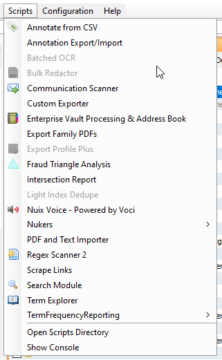 The scripts menu in Nuix Workstation provides a convenient way to execute scripts: