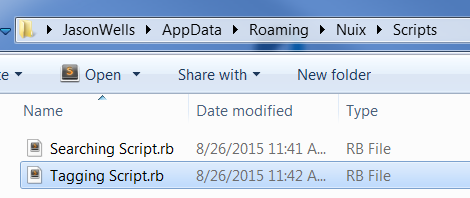 C:\Users\USERNAME\AppData\Roaming\Nuix\ScriptswhereUSERNAMEis the specific user’s name.